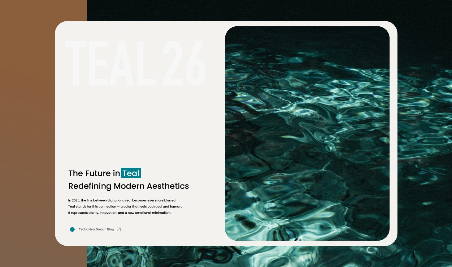 2026年に向けて「変化を感じさせるティール × 安心感を与えるウォームブラウン」を組み合わせることで、デザインにトレンド感を与えることができます。