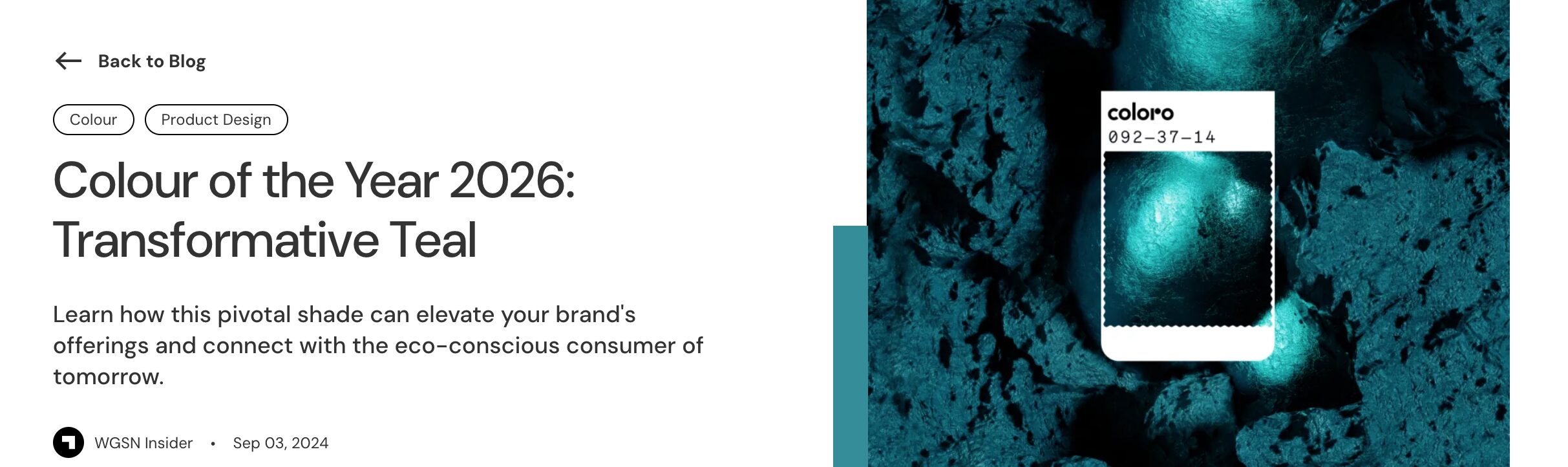 WGSN/Coloro といったトレンド予測機関では、2026年のキーカラーとして「ティール」(青+緑寄りの中間色)を取り上げています。