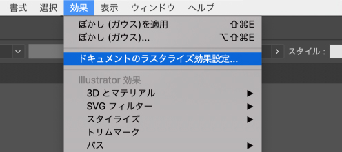 上部メニューから「効果」→「ドキュメントのラスタライズ効果設定」をクリックします。