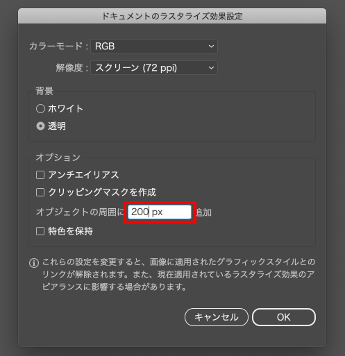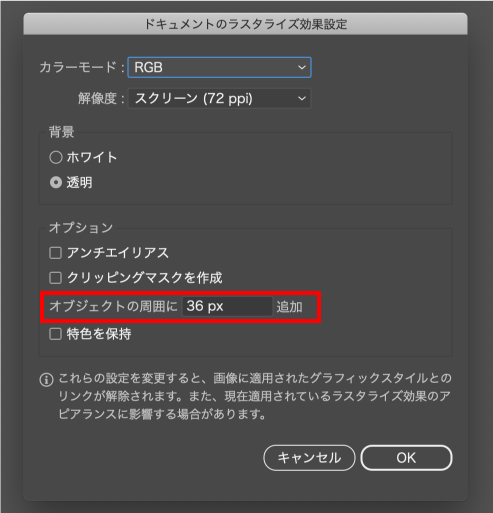 「ドキュメントのラスタライズ効果設定」のダイアログが開いたら、下の方に「オブジェクトの周囲に〜」という項目があるので、今回はここの数値を変えていきます。