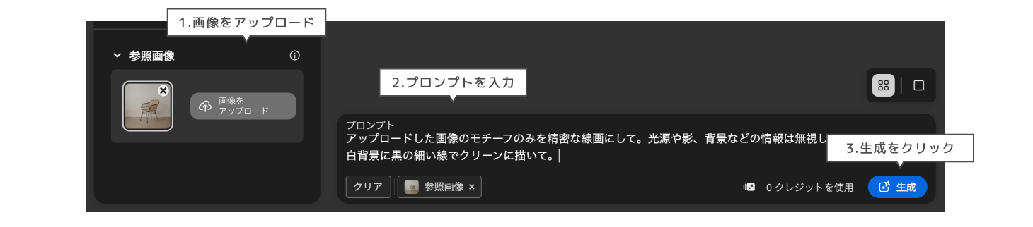 参照画像をアップロードできたら、以下のプロンプトを入力して生成をクリックします。